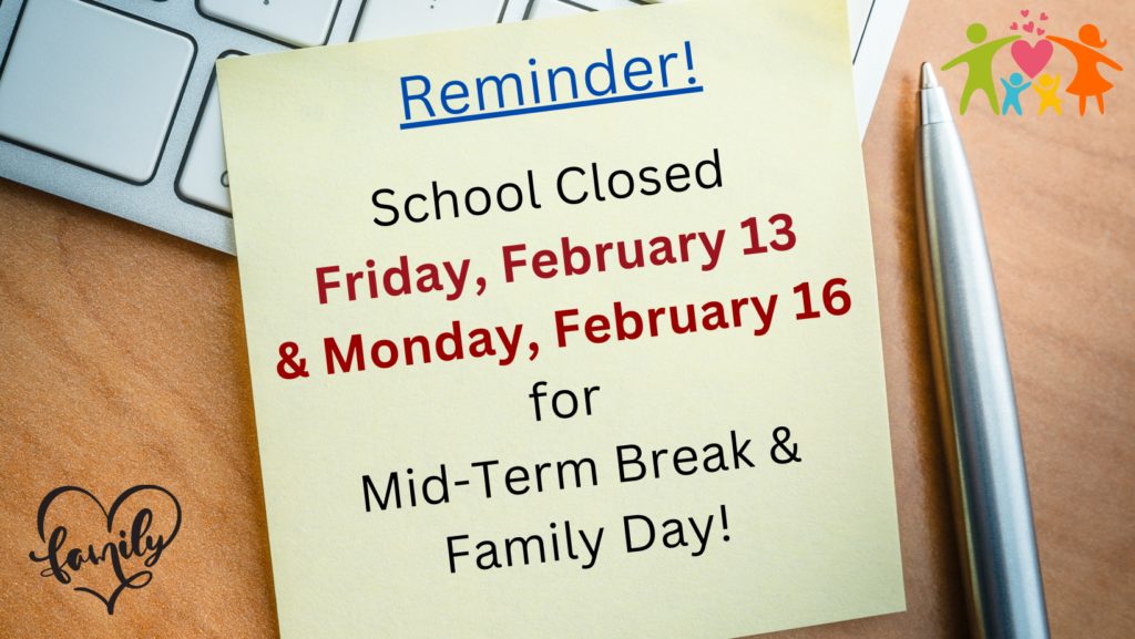 School will be closed on Friday, February 13 for our Mid-Term Break and on Monday, February 16 for Family Day. We hope everyone has a fun and safe long weekend!