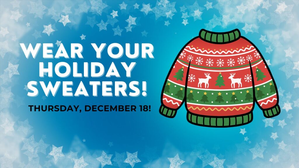 Thursday, December 18 is our Casual Day and Spirit Day! Students can wear their coolest, craziest, wackiest Holiday Sweaters! Participation is optional.