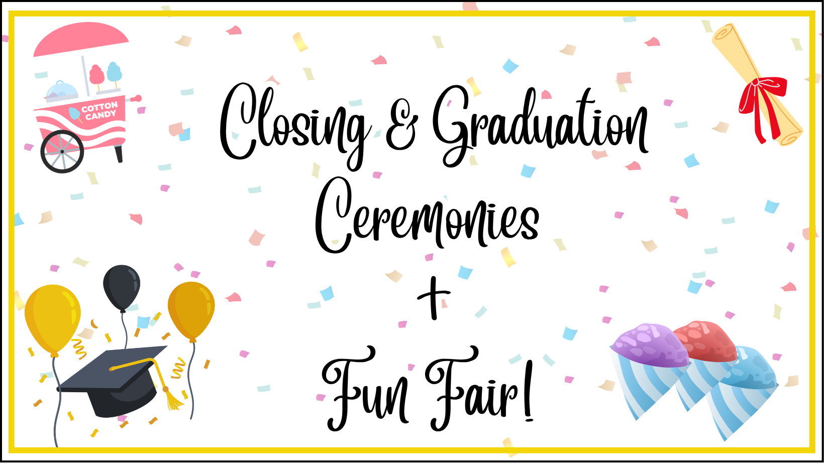 First, our Secondary Closing and Graduation Ceremony will be held at 9:30am. Then, our Elementary Closing and Grade 8 Graduation Ceremony will be held at 11:30am. Parents are invited to these events and a small reception will be held after each ceremony.