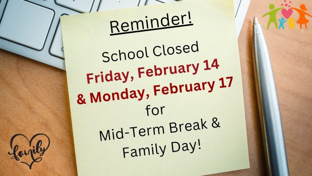 School will be closed on Friday, February 14th for our Mid-Term Break and on Monday, February 17th for Family Day. We hope everyone has a fun and safe long weekend!