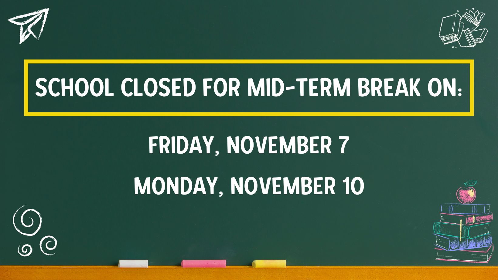 School will be closed on Friday, November 7 and Monday, November 10 for our Mid-Term break.